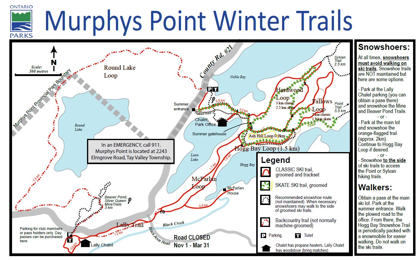 Our trail network is located at Murphys Point Provincial Park on the shores of the Big Rideau Lake in eastern Ontario. Located on the Frontenac Arch extending southeastward from the Canadian Shield, it offers an ideal environment for recreational and competitive skiing or snowshoeing. Our network of trails provides access to several interesting archaeological sites as well as restored heritage buildings left open for rest and shelter on the trail.